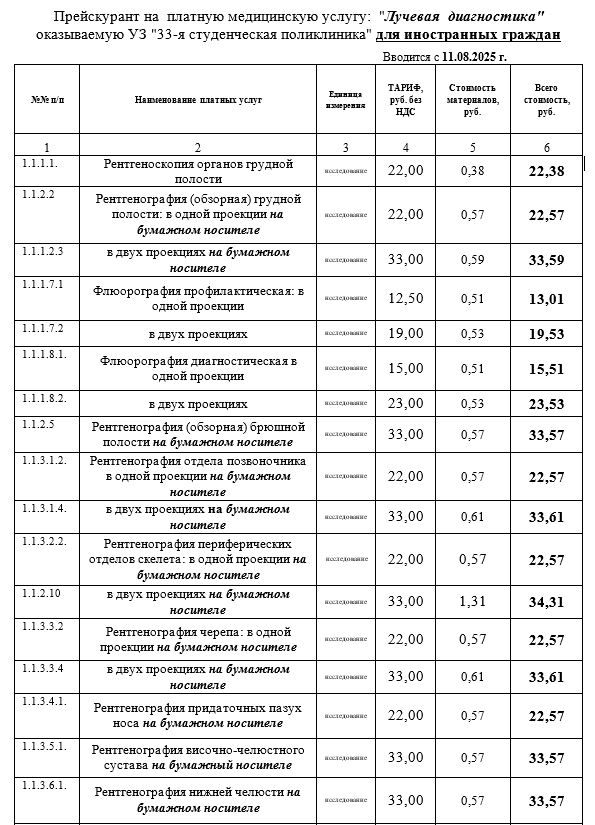 Прейскурант на платные медицинские услуги для иностранных граждан